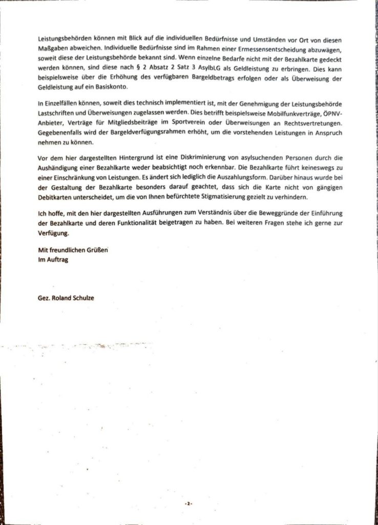 Wir bitten Sie als politisch Verantwortliche in der Landesregierung und den Regierungsparteien eindringlich, den Weg der Ausgrenzung zu verlassen und eine solidarische, menschenrechtsbasierte Sozialpolitik umzusetzen. Die Bezahlkarte ist teuer, ineffektiv und unmenschliche Schikane. Sie schadet Menschen, sie schadet dem gesellschaftlichen Zusammenhalt und sie schadet dem Vertrauen in eine soziale Demokratie.