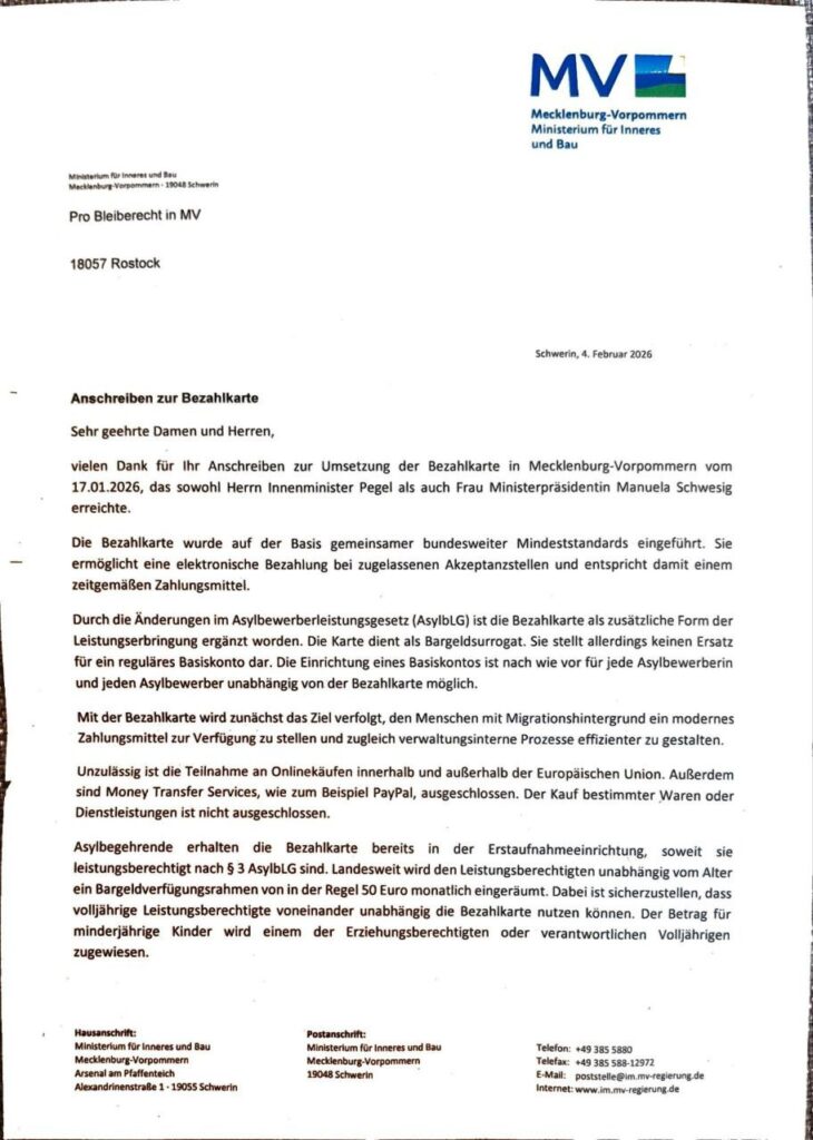 in den vergangenen Monaten wurde flächendeckend in Mecklenburg-Vorpommern die Bezahlkarte für Geflüchtete eingeführt. Seitdem erleben wir, wie dieses System Geflüchtete tagtäglich diskriminiert, ausgrenzt und in ihrem Alltag massiv einschränkt. Die Bezahlkarte verschärft soziale Ungleichheit, verhindert Teilhabe und verletzt grundlegende Menschenrechte. Die Bezahlkarte ist ein Desintegrations-Programm.
